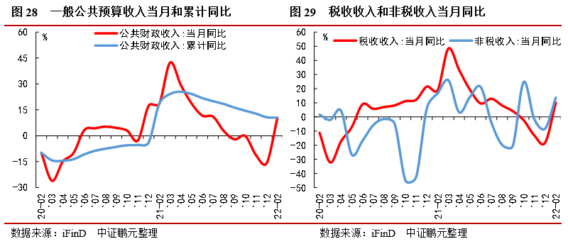 全國公共財政收入明顯加快,稅收和非稅收入均回升。1-2月累計,全國一般公共預(yù)算收入46,203億元,累計同比增長10.5%,前2月累計財政收入占全年預(yù)算收入比重達到22.0%,處同期高位;從當(dāng)月同比來看,扭轉(zhuǎn)負增長態(tài)勢,大幅高于去年12月當(dāng)月同比增速-15.8%,開局表現(xiàn)良好。拆分來看,稅收收入、非稅收入同比增長10.1%、13.7%,去年12月同比為-18.3%、-8.3%,增速由負轉(zhuǎn)正大幅提高,非稅收入增速略高于稅收收入增速,主因今年非稅收入的特定國有金融機構(gòu)上繳利潤(前2年暫停繳納),今年非稅收入有較大的增長空間。資源稅、個人所得稅大幅增長,同比增速為92.2%、46.8%,土地增值稅同比下降1.4%。