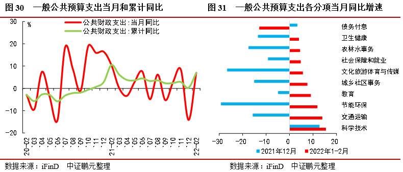 全國公共財政支出回升,靠前發(fā)力,基建支出加快。1-2月累計,全國一般公共預(yù)算支出38,227億元,同比增長7.0%,較2021年全年同比0.3%明顯上升,大幅高于2021年12月當(dāng)月同比-14.2%。前2月的財政支出占全年預(yù)算支出的比重達到14.3%,創(chuàng)同期新高,體現(xiàn)了積極的財政政策,發(fā)力靠前。分結(jié)構(gòu)來看,10個支出分項中累計同比增速由高至低:科學(xué)技術(shù)(15.5%)、交通運輸(14.0%)、節(jié)能環(huán)保(11.9%)、教育(9.1%)、城鄉(xiāng)社區(qū)事務(wù)(7.6%)、文化旅游體育與傳媒(5.7%)、社會保障和就業(yè)(7.8%)、農(nóng)林水事務(wù)(3.5%)、衛(wèi)生健康(4.0%)、債務(wù)付息(-12.9%)。基建支出(交通運輸、城鄉(xiāng)社區(qū)事務(wù)、農(nóng)林水事務(wù))表現(xiàn)較快增長,1-2月增長8.0%,大幅高于去年12月單月同比-16.4%、也高于去年12月兩年平均增速-4.8%。民生性支出(衛(wèi)生健康、社會保障和就業(yè)、教育)也表現(xiàn)較好,科學(xué)技術(shù)支出增速最快。