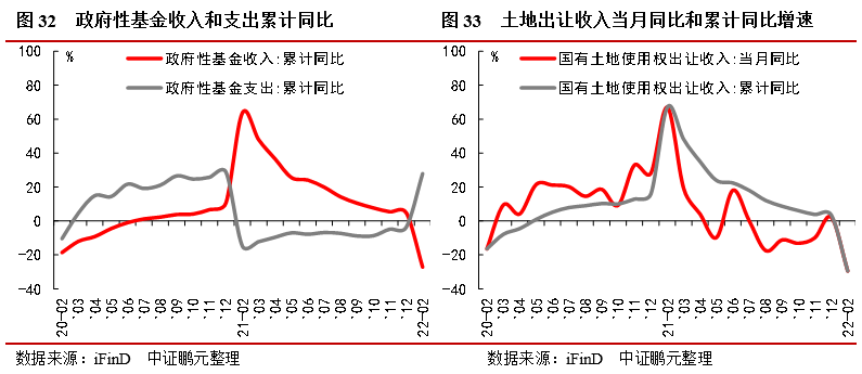 政府性基金收入負增長,主要受土地出讓金拖累。1-2月累計,全國政府性基金預(yù)算收入9,159億元,同比下降27.2%,由正轉(zhuǎn)負大幅減少,去年全年增速為4.8%。其中,國有土地使用權(quán)出讓收入7,922億元,同比下降29.5%,低于去年全年同比3.5%,也低于去年12月當(dāng)月同比2.2%,在商品房銷售、竣工同比繼續(xù)回落情況下,地產(chǎn)表現(xiàn)低迷,土地出讓金銳減也是預(yù)料之中,是政府性基金預(yù)算收入主要拖累因素。