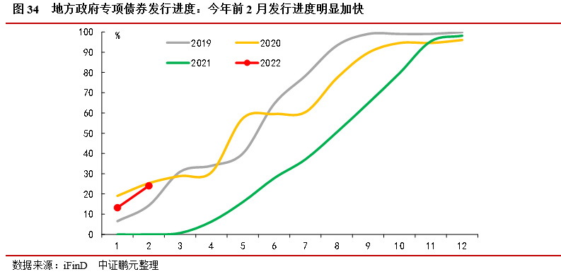 政府性基金支出加快,專項債發(fā)行前置。1-2月累計,全國政府性基金預(yù)算支出14,042億元,同比增長27.9%,支出加快,大幅高于去年全年的-3.7%增速。1-2月新增專項債共計發(fā)行8,775億元,占提前批額度的60.1%,較去年同期明顯加快。1-2月專項債累計發(fā)行進度為24.0%,明顯高于2019年和2021年同期增速,接近2020年25.3%的發(fā)行進度,專項債整體節(jié)奏靠前發(fā)力,加快政府性基金支出。