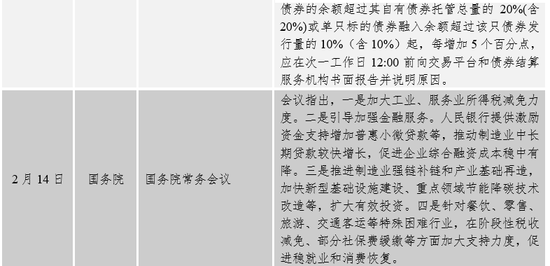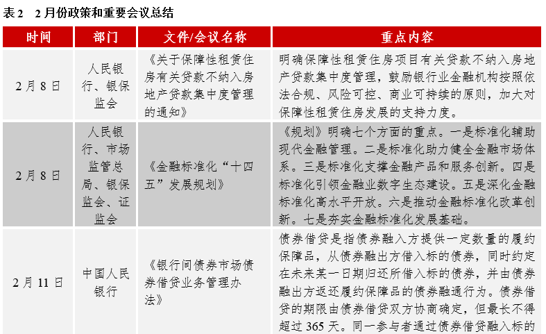 債券市場制度建設(shè)方面:2月8日,人民銀行、市場監(jiān)管總局等部門聯(lián)合印發(fā)《金融標準化“十四五”發(fā)展規(guī)劃》,明確七個方面的重點,提出到2025年,與現(xiàn)代金融體系相適應(yīng)的標準體系基本建成,金融標準化的經(jīng)濟效益、社會效益、質(zhì)量效益和生態(tài)效益充分顯現(xiàn),標準化支撐金融業(yè)高質(zhì)量發(fā)展的地位和作用更加凸顯。展望2035年,科學(xué)適用、結(jié)構(gòu)合理、開放兼容、國際接軌的金融標準體系更加健全,市場驅(qū)動、政府引導(dǎo)、企業(yè)為主、社會參與、開放融合的金融標準化工作格局全面形成,標準化成為支撐金融業(yè)高質(zhì)量發(fā)展的重要力量。2月8日,人民銀行、銀保監(jiān)會明確保障性租賃住房項目有關(guān)貸款不納入房地產(chǎn)貸款集中度管理,加大對保障性租賃住房發(fā)展的支持力度。2月11日,人民銀行發(fā)布《銀行間債券市場債券借貸業(yè)務(wù)管理辦法》,對債券借貸對象、要求、期限等進行了規(guī)定,增加了集中債券借貸業(yè)務(wù)。