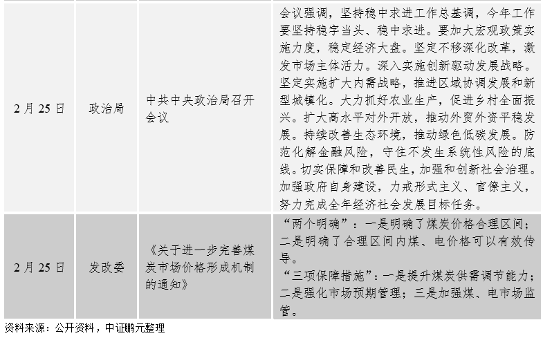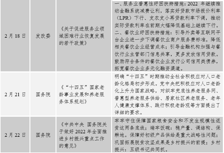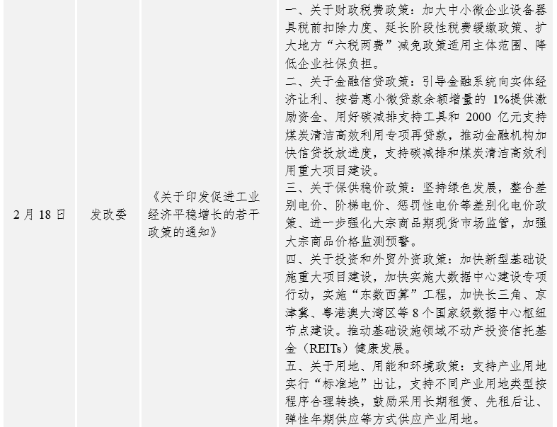 宏觀經(jīng)濟設(shè)計方面:主要圍繞穩(wěn)增長出臺一系列政策和措施。中共中央政治局召開會議,討論國務(wù)院擬提請第十三屆全國人民代表大會第五次會議審議的《政府工作報告》稿。會議強調(diào),堅持穩(wěn)中求進工作總基調(diào),著力穩(wěn)定宏觀經(jīng)濟大盤,保持經(jīng)濟運行在合理區(qū)間,保持社會大局穩(wěn)定,迎接黨的二十大勝利召開。今年工作要堅持穩(wěn)字當(dāng)頭、穩(wěn)中求進。要加大宏觀政策實施力度,堅定實施擴大內(nèi)需戰(zhàn)略,推動外貿(mào)外資平穩(wěn)發(fā)展,防范化解金融風(fēng)險,守住不發(fā)生系統(tǒng)性風(fēng)險的底線,努力完成全年經(jīng)濟社會發(fā)展目標任務(wù)。國務(wù)院常務(wù)會議要求加大工業(yè)、服務(wù)業(yè)、消費業(yè)所得稅減免力度,支持增加普惠小微貸款等,推動制造業(yè)中長期貸款較快增長,促進企業(yè)綜合融資成本穩(wěn)中有降,加快新型基礎(chǔ)設(shè)施建設(shè)、重點領(lǐng)域節(jié)能降碳技術(shù)改造等,擴大有效投資。發(fā)改委相繼印發(fā)了《關(guān)于印發(fā)促進工業(yè)經(jīng)濟平穩(wěn)增長的若干政策的通知》、《關(guān)于促進服務(wù)業(yè)領(lǐng)域困難行業(yè)恢復(fù)發(fā)展的若干政策》、《關(guān)于進一步完善煤炭市場價格形成機制的通知》,加大工業(yè)、服務(wù)業(yè)、煤炭業(yè)的支持措施。