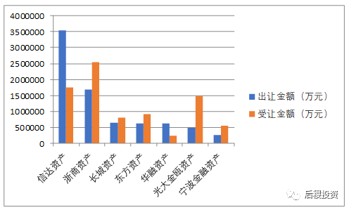 圖中數據為持牌AMC在整個不良市場所有收包、出包金額統計。從對比數據上看,僅信達資產和華融資產出讓金額>受讓金額;長城資產收、出包金額相對平衡。