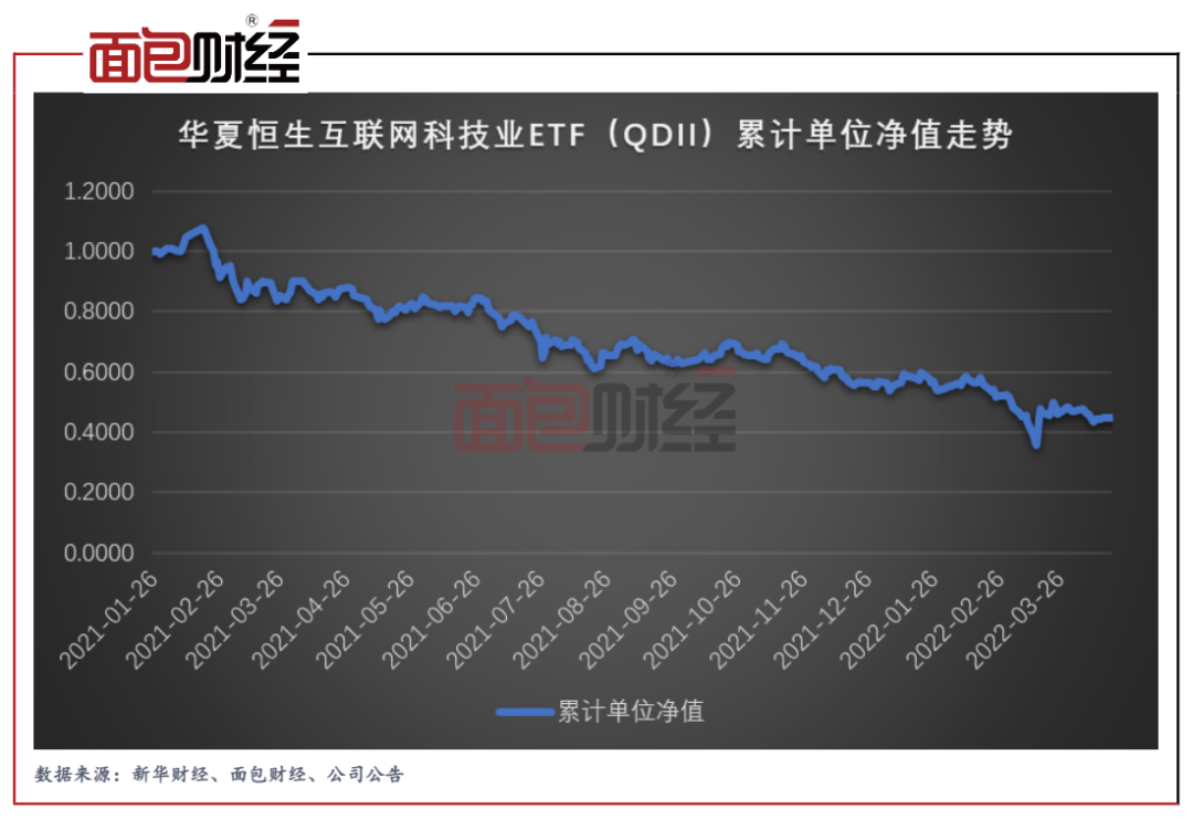 自基金成立以來,華夏恒生互聯網科技業ETF(QDII)的凈值持續下行。投資者如果成立時買入持有至今,目前已經虧損過半。財報顯示,該基金2021年凈虧損52.94億元,主要來自于公允價值變動損失。