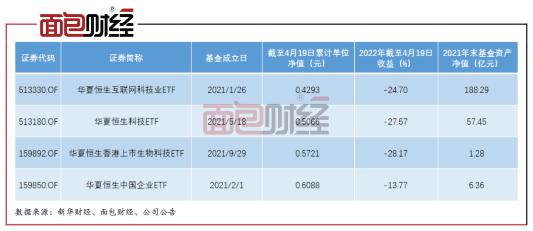 華夏恒生互聯網科技業ETF(QDII)、華夏恒生科技ETF(QDII)是華夏基金旗下規模靠前的產品。截至2022年4月19日,這兩只產品的累計單位凈值分別跌至0.4293元和0.5066元,今年以來分別下跌24.70%和27.57%。