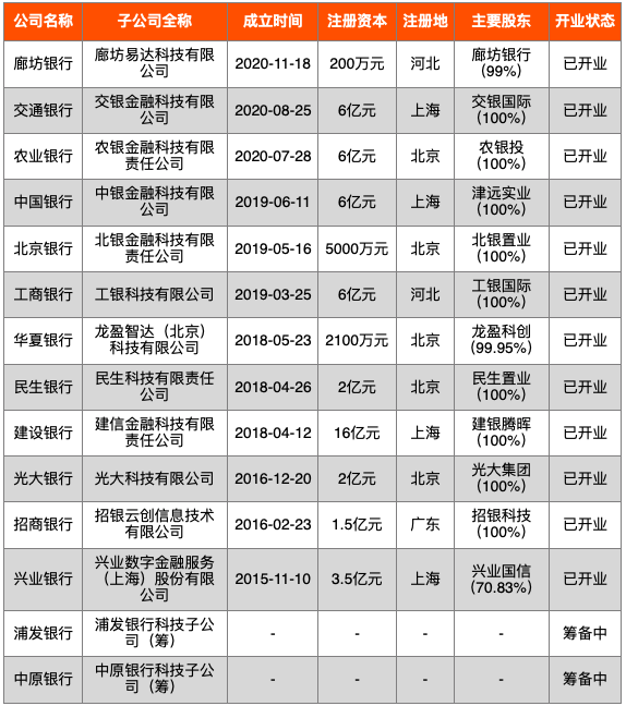 從注冊資本來看,最高的是建設銀行旗下的建信金融科技有限責任公司,其注冊資本金高達16億元,最低的是2020年11月廊坊銀行新成立的廊坊易達科技有限公司,其注冊資本金僅為200萬元,遠低于其余11家商業銀行金融科技子公司。