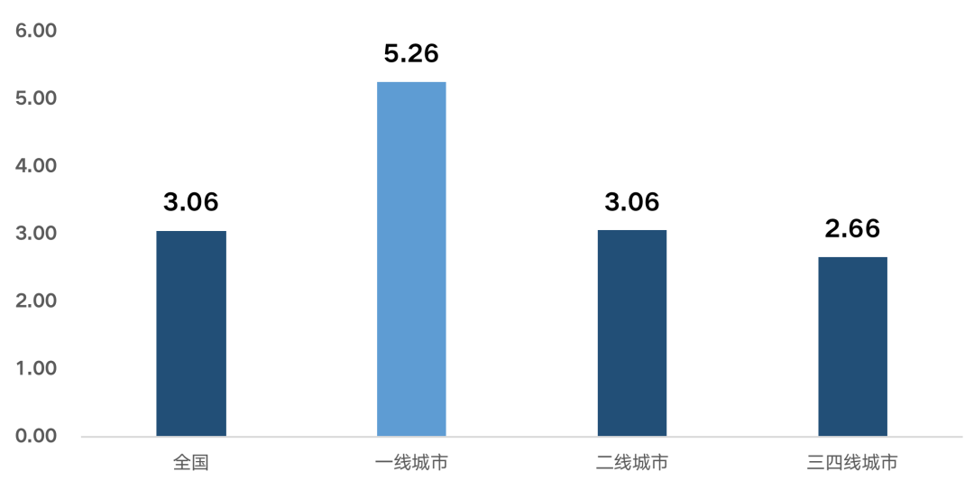 對比2020年500強物企各類管理業態的物業費水平,產業園區物業費為3.06元/m2/月,僅高于住宅物業的2.24元/m2/月。但是,從區域對比來看,一線城市園區物業管理費水平顯著高于其它城市,其中,一線城市園區物業費水平為5.26元/m2/月,二線及全國平均為3.06元/m2/月。