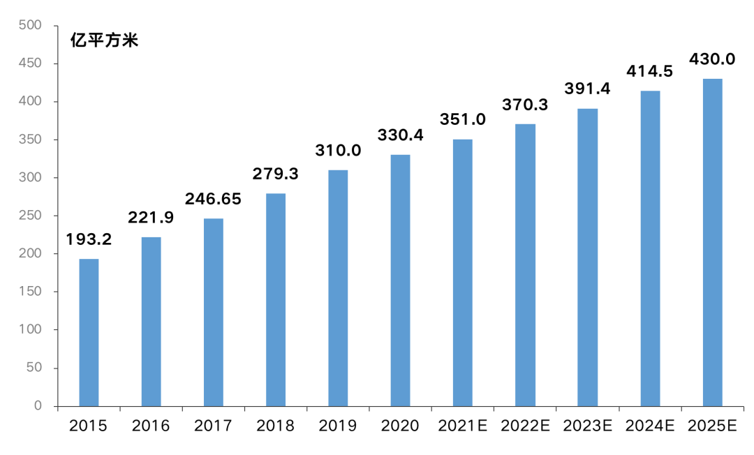 圖:2015-2025E年全國物業管理行業管理面積分布及預測