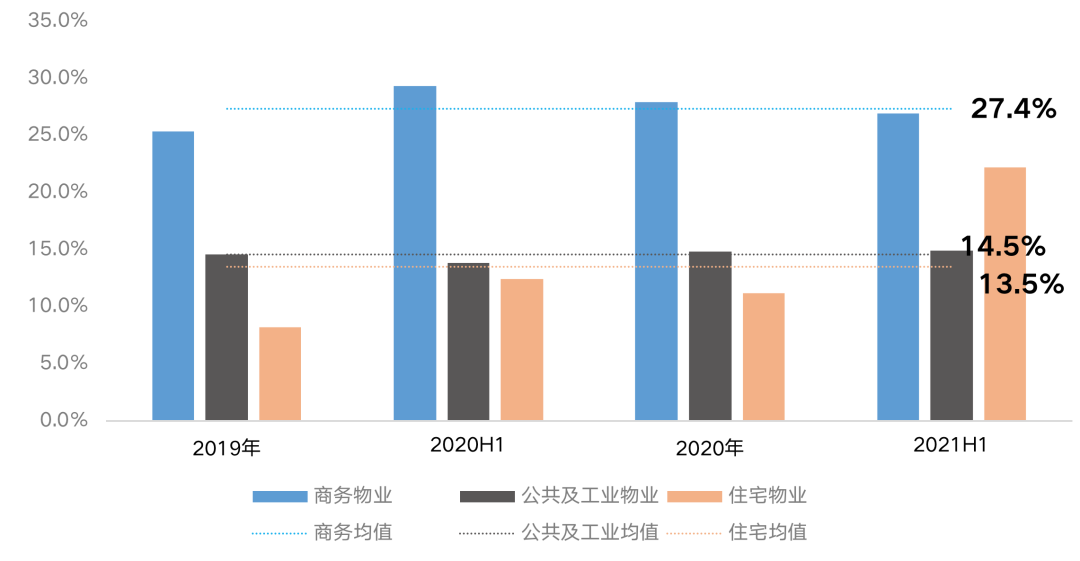 從企業數據來推算,卓越商企服務公布了較詳細的分業態毛利率水平。其商務物業毛利率均值為27.4%,公共及工業物業毛利率為14.5%,住宅為13.5%。工業物業毛利率與商務類有顯著差距,但高于住宅物業的盈利水平。