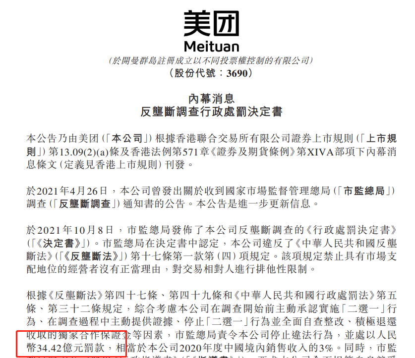 10月8日,國家市場監(jiān)管總局根據(jù)《中華人民共和國反壟斷法》第四十七條、第四十九條規(guī)定,綜合考慮美團違法行為的性質(zhì),依法作出行政處罰決定,責(zé)令美團停止違法行為,并處以其2020年中國境內(nèi)銷售額3%的罰款,計34.42億元。