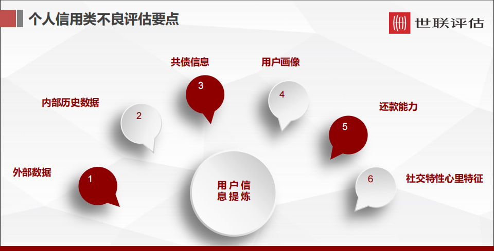 用戶信息提煉包括外部數據。我們可以借鑒一些外部的個貸參考數據。銀行的歷史數據非常重要,如果銀行能夠提供一些歷史數據,我們就可以做銀行歷史數據和靜態池的論證,以此倒推現在的情況。