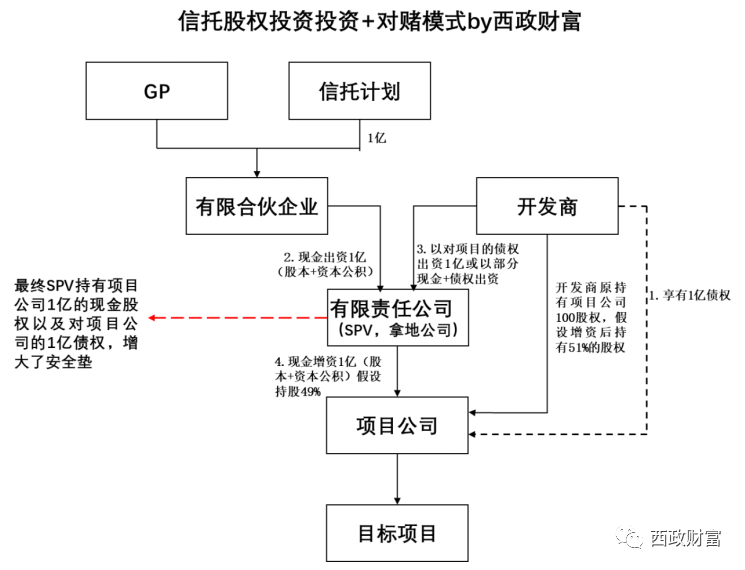 1. 信托計(jì)劃投資有限合伙L(fēng)P份額(即1億)對有限責(zé)任公司SPV進(jìn)行增資,部分進(jìn)入實(shí)收資本,大部分進(jìn)入資本公積。開發(fā)商則以對項(xiàng)目公司的債權(quán)(或債權(quán)+部分現(xiàn)金)對SPV進(jìn)行出資。