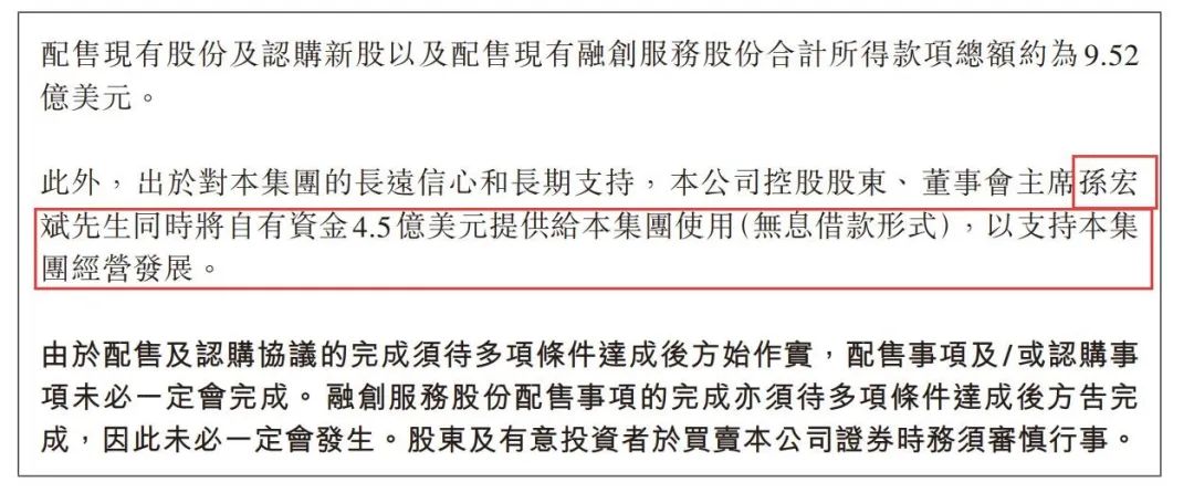 11月14日,融創中國公告披露:融創的董事會主席孫宏斌先生,將自有資金4.5億美元無息提供給集團,以支持融創的經營發展。