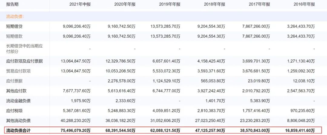 先來看看流動負債,如上圖,企業預警通統計的數據顯示,2021年中期,融創中國的流動負債合計7549.6億元,比2020年末的6839.2億元增長了約710.4億元,杠桿地產看到,主要是各種應付款項的增加。