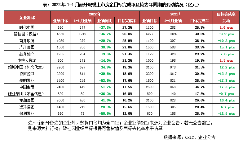 整體來看,今年以來即使大部分房企不披露目標(biāo),或是已經(jīng)主動調(diào)降了銷售目標(biāo)。但受一季度以來行業(yè)信心不足、市場低迷以及部分城市疫情反復(fù)等多方面因素的影響,目前企業(yè)實(shí)際的業(yè)績完成情況仍不及預(yù)期,年內(nèi)銷售去化壓力放大。全年仍會有一定數(shù)量的房企出現(xiàn)業(yè)績規(guī)模負(fù)增長。