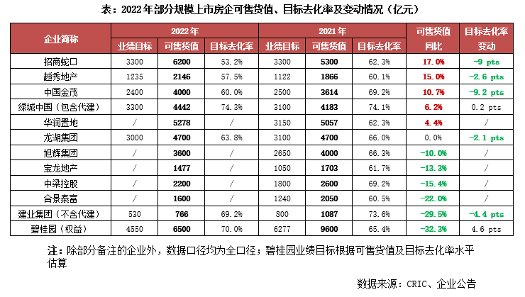 從年內(nèi)可售貨值及貨值目標(biāo)去化率的角度來看,一類房企如招商、越秀、金茂、綠城、華潤置地等,2022年全年的預(yù)期總可售貨值都高于2021年水平。其中,招商、越秀和金茂2022年的貨值目標(biāo)去化率(年度目標(biāo)銷售規(guī)模/年內(nèi)預(yù)期總可售貨值)較去年有明顯降低。這部分企業(yè)旨在通過增加全年貨量供應(yīng)來實(shí)現(xiàn)年度業(yè)績目標(biāo)。