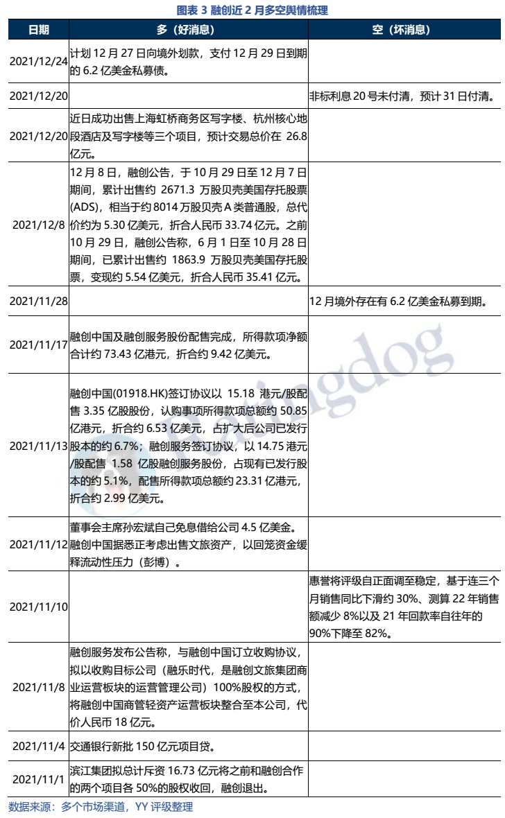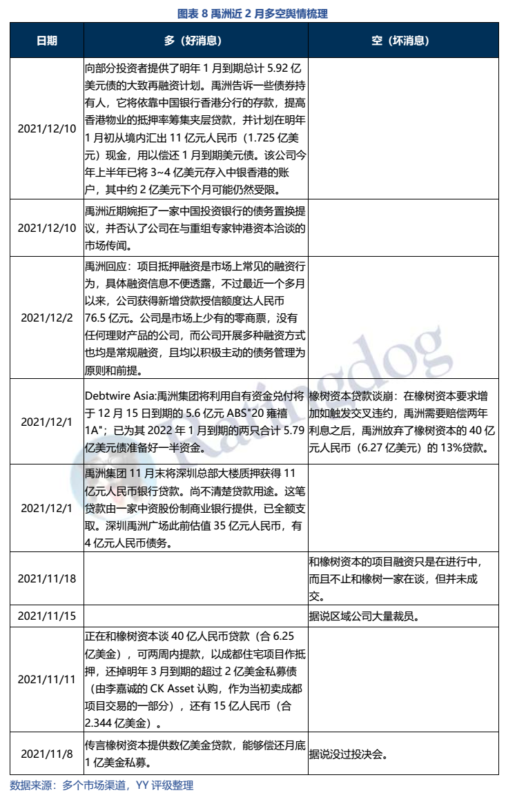 禹洲最臨近的到期公開債務分別是2022年1月的5.79億美元債+4月35億境內債回售+3億供應鏈ABS,近兩個月公司主要的輿情均與再融資相關: