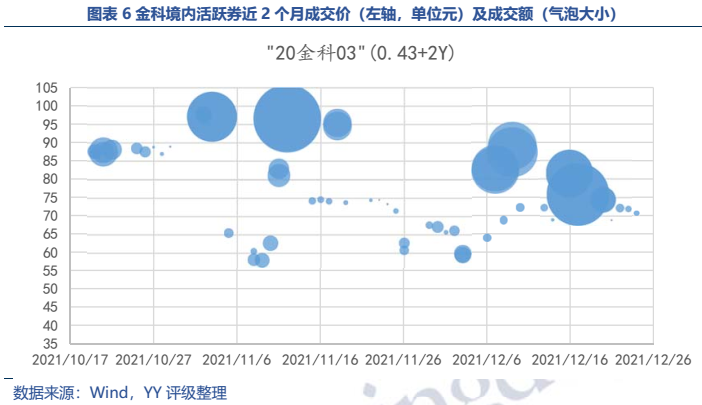 金科近兩月加強了債券投資人溝通,對于市場傳聞及負面輿情反應也較為迅速,聲稱無任何融資逾期。從活躍券“20金科03”成交來看,11月初及12月初曾一度跌至60元以下,隨后隨著金融監管機構對房企融資釋放暖意,債券價格有所回升,目前在70元檔位。