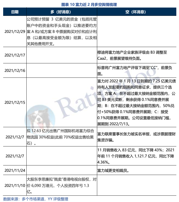 相較于今年暴露風險的民企,富力債務重壓問題盤亙已久,市場皆知,但公司仍通過銷售、資產出售和股東借款硬扛了許久,繼9月大股東將“倒賣”富力物業的收益借給公司后,12月公司以12.63億元清空了廣州物流園股權。面對行業下行及2022年1月到期的7.25億美元債,富力最終還是沒抗住,向持有人發起交換要約試圖將一部分債務展期支付。