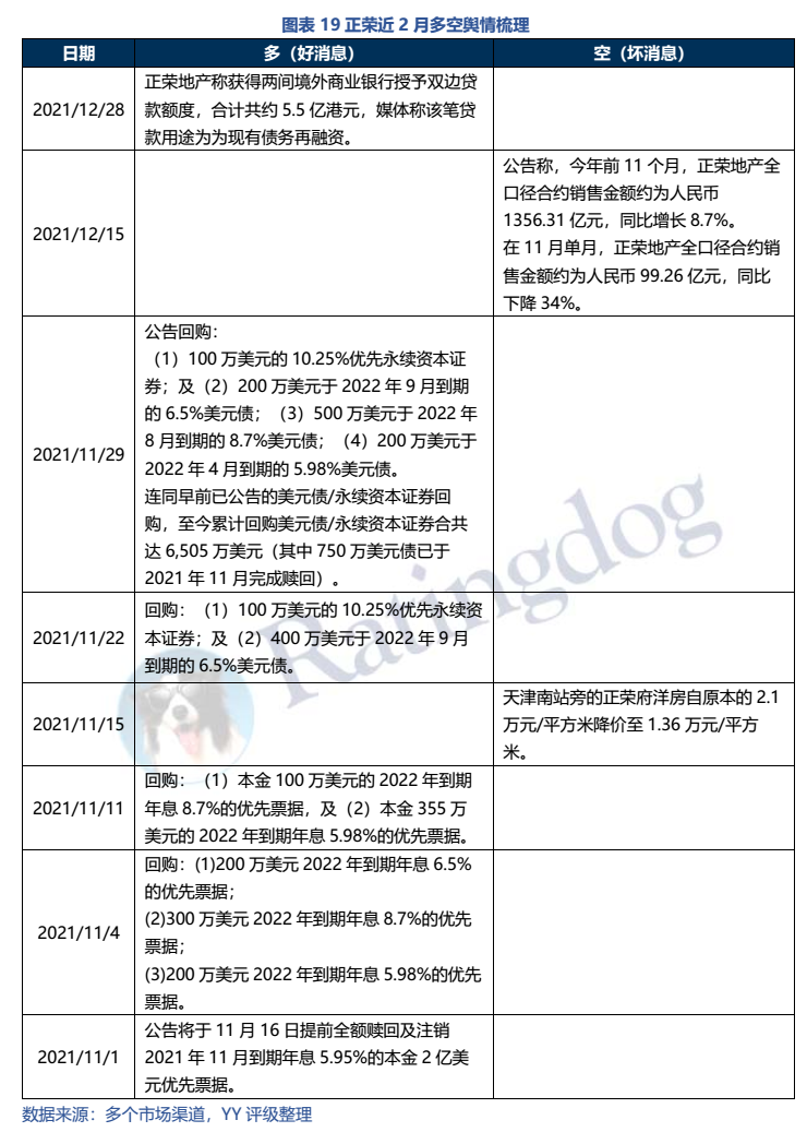 (6)尋求金融機構支持:世茂尋求招行增加敞口、和信托談展期,禹洲找橡樹資本融資(未果),正榮獲得境外銀行雙邊貸款。