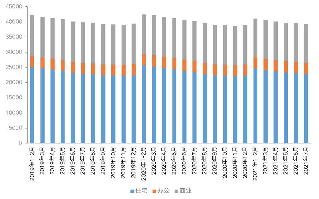 2021年以來,全國整體庫存穩中有降,國家統計局公布數據顯示,7月末,商品房待售面積50864萬平方米,比6月末減少215萬平方米。其中,住宅待售面積減少270萬平方米,辦公樓待售面積減少26萬平方米,商業營業用房待售面積增加19萬平方米。