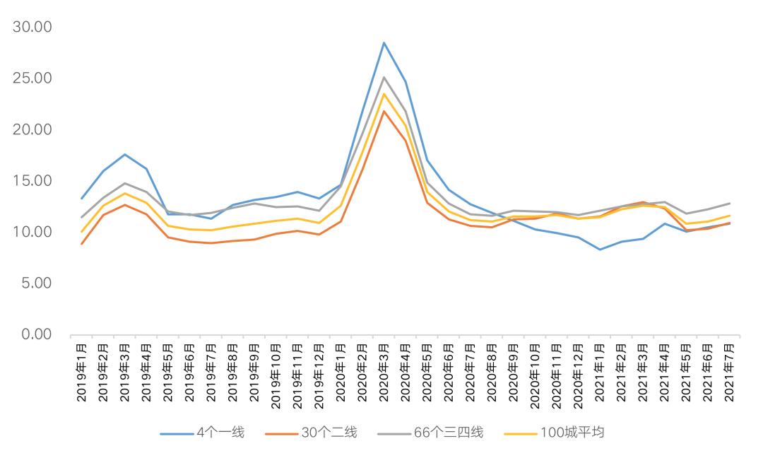 由于7月整體供需兩淡,整體成交增長也有轉弱的趨勢,狹義庫存與上月基本持平,去化周期為11.67個月。分能級來看,一線成交熱度延續,市場韌性較強,去化周期環比微增至10.86個月,但仍顯著低于2020年同期水平。二三線去化周期同環比齊增,維持在11-13個月左右,整體庫存風險基本可控。