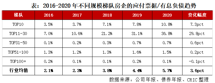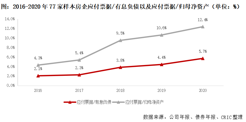 2017年以來,房地產外部融資環境處于全面高壓狀態,銀行信貸、私募資管計劃、委托貸款和銀信合作等融資渠道均受到限制,海外發債政策也隨之收緊,2020年“三條紅線”新規進一步限制房企債權融資的能力。房企流動性壓力逐年遞增的情況下,應付票據規模也有明顯的抬升。