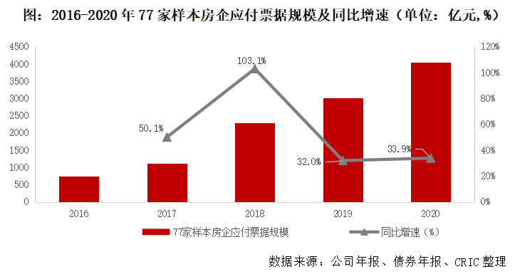 從絕對值來看,77家樣本房企①應付票據規模從2016年750.74億元增長至2020年的4040.95億元,復合增速52.3%,歷年增速均維持在30%以上。