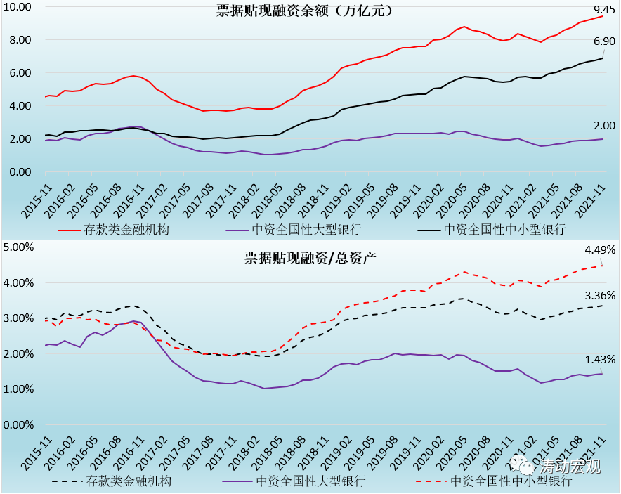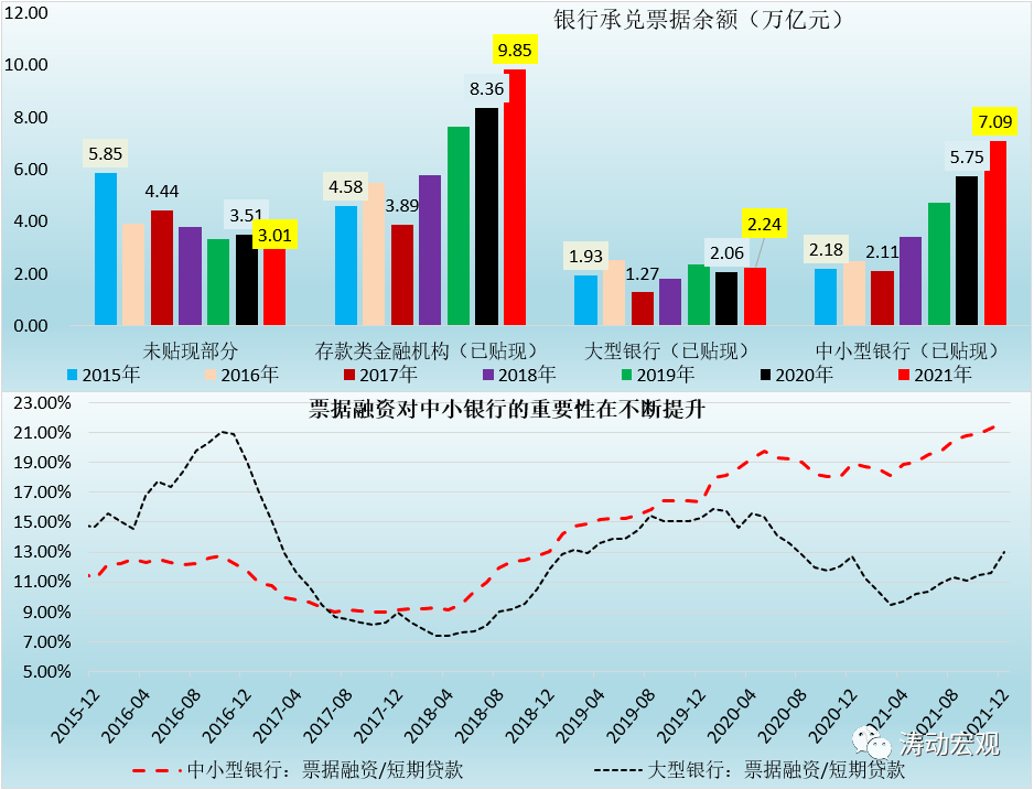 對于銀行承兌匯票數(shù)據(jù)的觀察可以從兩個指標(biāo)來看,即社融指標(biāo)的未貼現(xiàn)銀票和已貼現(xiàn)銀票,前者被視為表外融資部分(通過每月公布的社融指標(biāo)來確定),后者則通常被視為銀行的表內(nèi)業(yè)務(wù)(通過金融機構(gòu)信貸收支表來確定)。具體看,截至2021年12月底,未貼現(xiàn)銀行承兌匯票余額達到3.01萬億,金融機構(gòu)提供的票據(jù)貼現(xiàn)融資余額為9.85萬億(本外幣口徑)。其中,大型銀行和中小型銀行的余額分別為2.24萬億和7.09萬億。