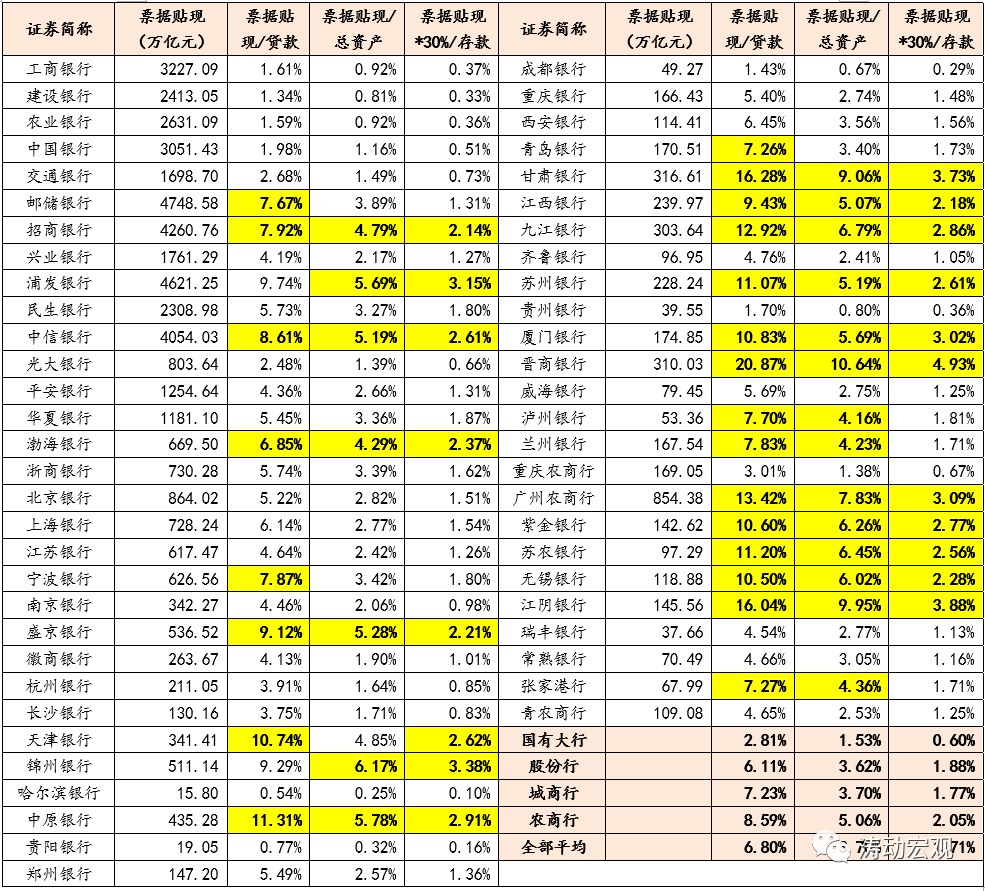 3、部分銀行的票據(jù)貼現(xiàn)余額占比明顯偏高,如23家上市銀行的票據(jù)貼現(xiàn)余額占其貸款的比例超過7%(56家上市銀行的平均水平為6.80%)、21家上市銀行的票據(jù)貼現(xiàn)余額占其總資產(chǎn)的比例超過4%(56家上市銀行的平均水平為3.70%)、19家上市銀行的票據(jù)保證金(按貼現(xiàn)余額的30%計算)占其存款的比例超過2%(56家上市銀行的平均水平為1.71%)。