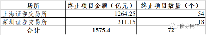 根據上海證券交易所和深圳證券交易所公司債券項目信息平臺的公開信息,2022年2月終止的債券項目金額合計為1575.40億元,終止項目數量72個。