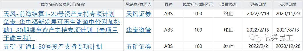 從具體申報產品的規模來看,單只債券終止金額最大的均是ABS產品,其中有3個ABS產品的金額為100億元,均屬于儲架類ABS產品。2022年以來,儲架類ABS產品終止的情況較多。重慶國際信托股份有限公司和廈門國際信托有限公司作為原始權益人申報的擬發行金額為400億元的“華融-新遠1-20期資產支持專項計劃”于2022年1月20日終止。債券民工查詢了一下交易所系統信息,僅在2022年1月就有3只總申報規模超過100億元的ABS產品被終止。而2021年全年被終止的100億元的ABS產品就更多了,僅在上交所終止的產品就有50只。