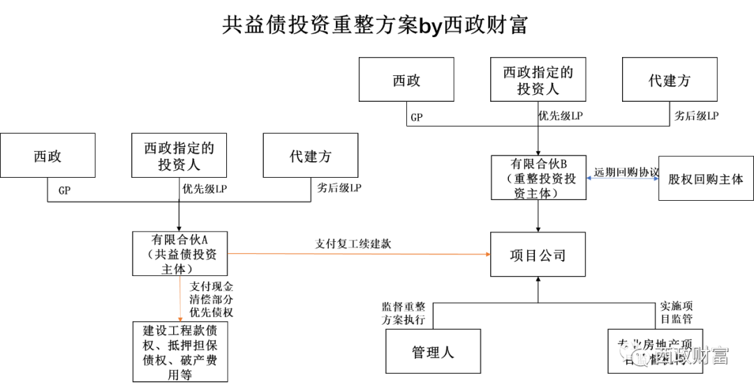 重整方案中我們對原有的債權以及股權結構均進行了調整,并在整個項目的還款節奏上進行了分階段的設置。為避免混同,共益債權投資部分與股權調整部分分別設立不同的主體(共益債投資主體以及重整投資主體)對項目公司進行投資,主要的盤活資金由共益債權投資部分支付,用于收購前期的抵押債權、支付欠付的工程款等;由于項目公司已資不抵債,股權價值為0,股權調整時通常由新設重整投資主體以較低的價格投入,并100%持股項目公司,并進行風控措施安排。