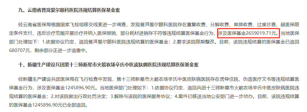 此外,隨著管理規模擴大,公司也面臨著合規、醫療糾紛等潛在風險。公開資料顯示,愛爾眼科子公司曾因違規使用醫保基金、違法發布廣告等原因受到行政處罰。比如,國家醫保局于2021年6月29日曝光10例典型案例,其中就包括普洱愛爾眼科醫院存在重復收費、分解收費、串換收費、過度診查、超醫保限定條件支付、違反診療范圍開展診療并納入醫保報銷、部分耗材進銷存不符等違規結算醫保基金行為,涉及醫保基金約265.9萬元。