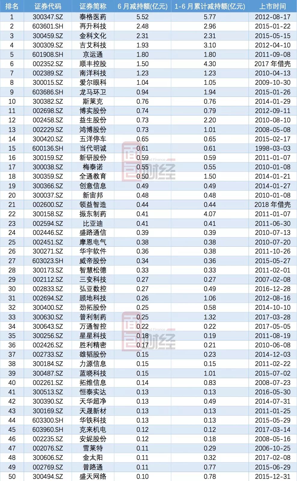 按2018年6月減持金額排行,排名前十的是泰格醫(yī)藥、再升科技、金科文化、吉艾科技、京運(yùn)通、順豐控股、南洋科技、愛爾眼科、龍馬環(huán)衛(wèi)、斯萊克。
