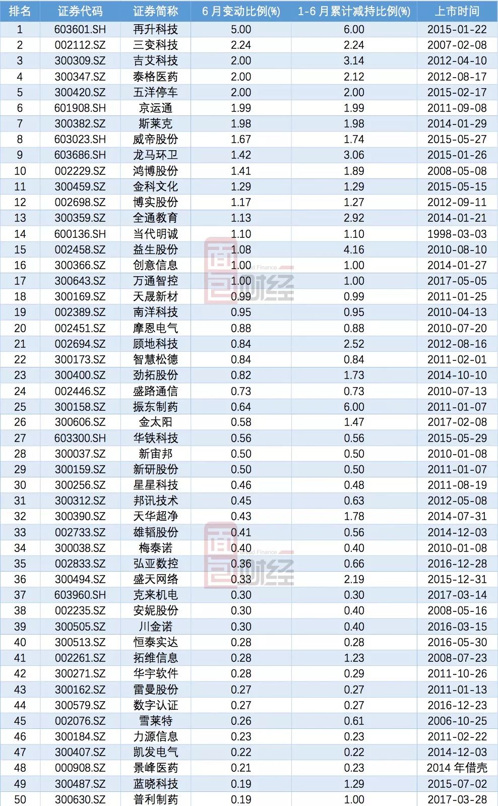 按照2018年6月減持比例排行,排名前十的是再升科技、三變科技、吉艾科技、泰格醫(yī)藥、五洋停車、京運(yùn)通、斯萊克、威帝股份、龍馬環(huán)衛(wèi)及鴻博股份。