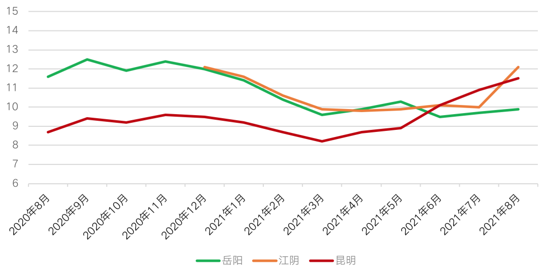 圖:2020年8月以來岳陽、江陰、昆明去化周期走勢(單位:月)