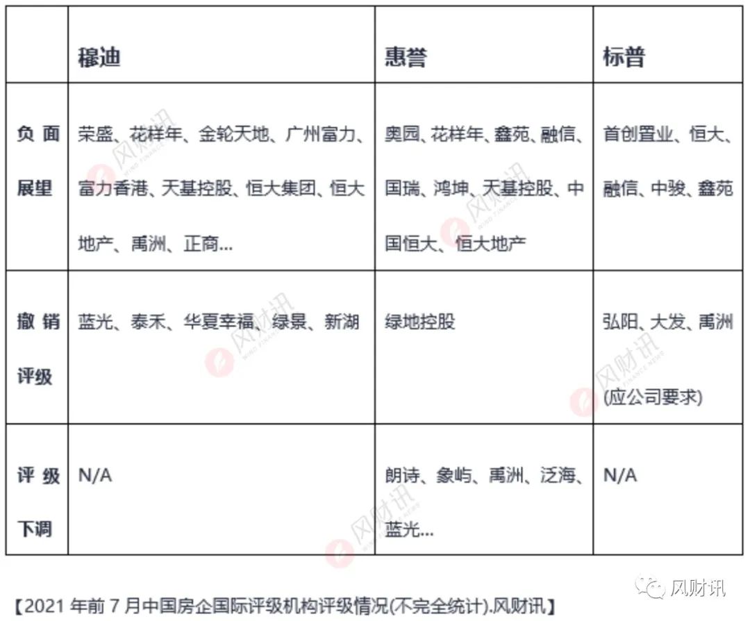 據(jù)風(fēng)財訊統(tǒng)計,截止2021年7月底,穆迪Moody's對中國房企的評級,“展望負面”的已經(jīng)超過10家,包括榮盛發(fā)展、廣州富力、禹洲、花樣年、富力香港、正商集團、金輪天地、天基控股、藍光發(fā)展等。