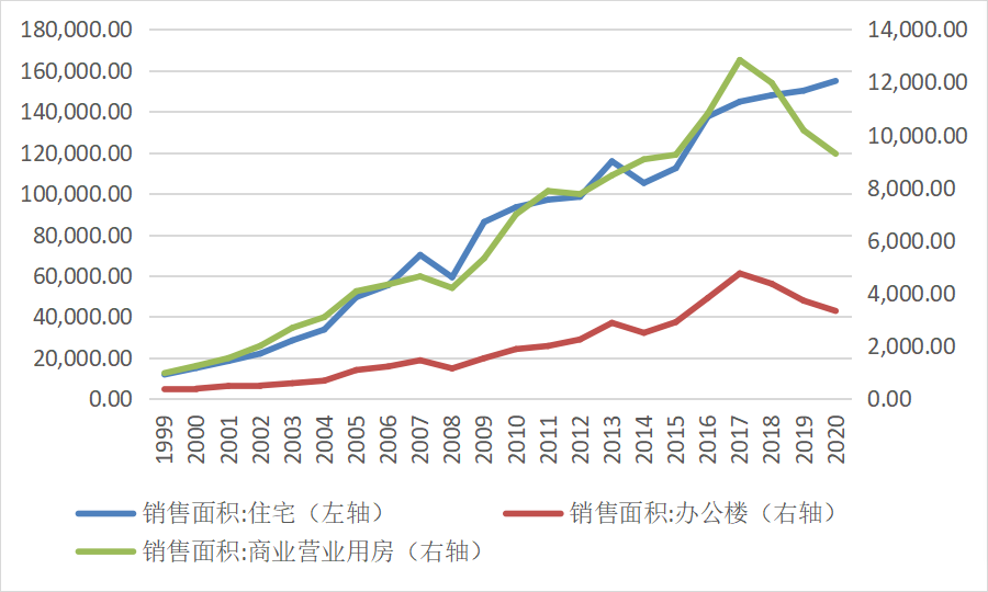 圖2.1999-2020年商品房銷售面積(單位:萬平方米)