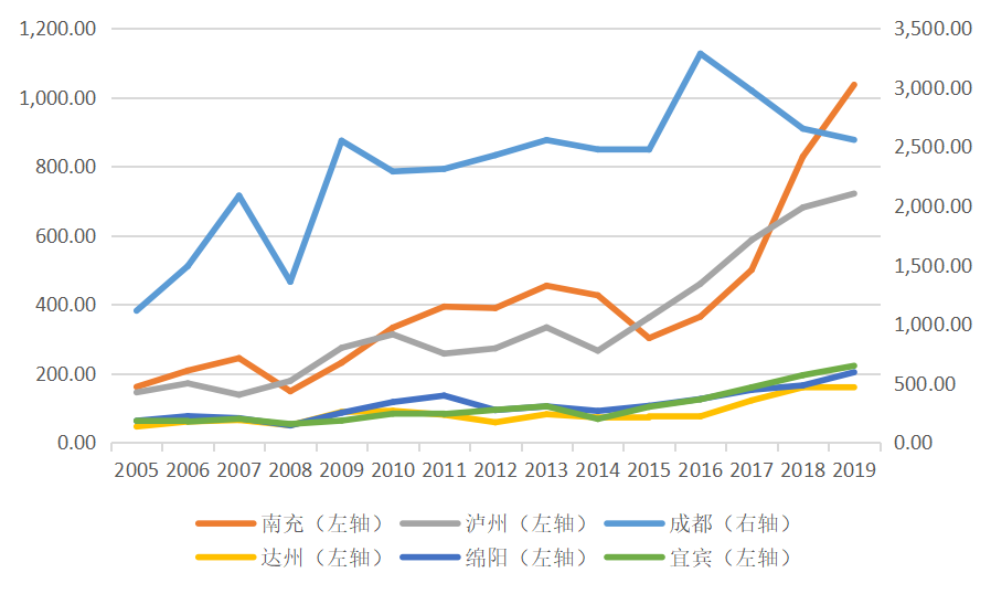 圖4.2005-2019年四川省典型區域商品房銷售面積(單位:萬平方米)