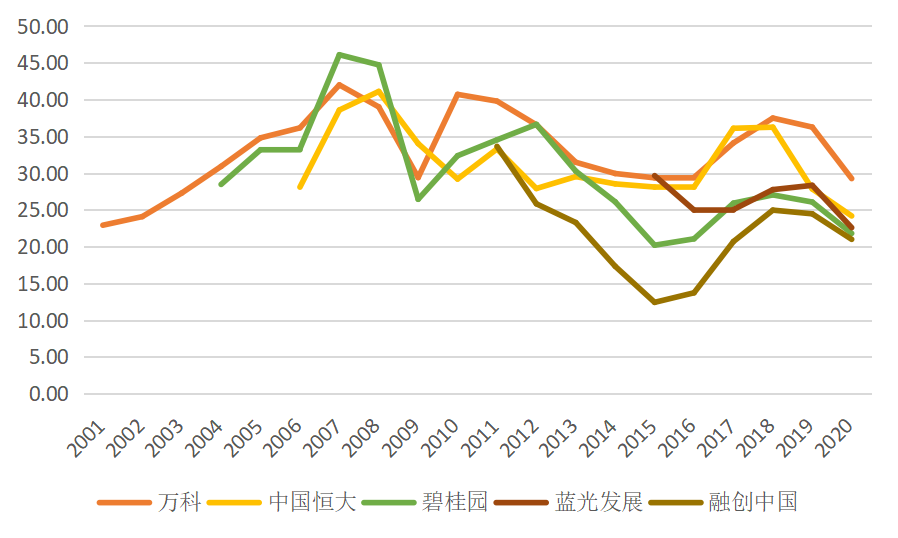 圖5.2001-2020年典型開發商銷售毛利率(單位:%)