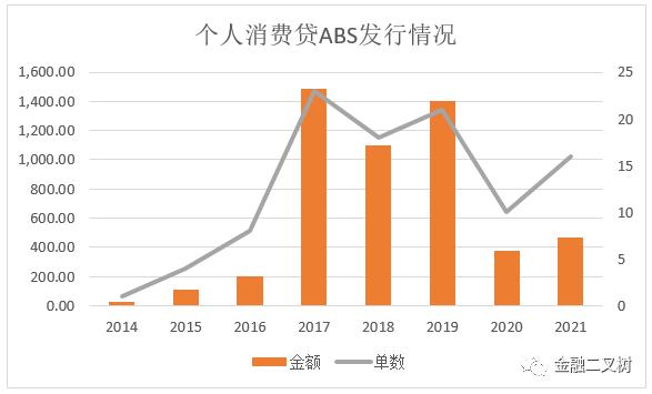 消費金融ABS曾經是資產證券化市場上的“熱搜”關鍵詞之一,2016年消費貸ABS開始迅速發展,到2017年已經占據了企業ABS市場份額的近三分之一,18年、19年消金ABS發展逐漸達到了頂峰,而螞蟻花唄被作為優質互聯網消金的代表,備受青睞,也成為發行量最大的消金ABS。20年受疫情影響,發行市場比較低迷,下半年隨著經濟的逐漸恢復,發行量又大幅提升。但是隨著螞蟻暫緩上市及被監管約談、小貸新規的發布,消金ABS沖高回落,發行逐漸趨于冷淡,消費金融ABS步入嚴監管時代。21年隨著疫情的緩和,消費市場逐漸回暖,但是嚴監管的態勢仍將延續消金ABS的發行規模仍在小幅回落。