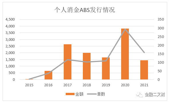 21年隨著疫情的緩和,消費市場逐漸回暖,但是嚴監管的態勢仍將延續消金ABS的發行規模仍在小幅回落。