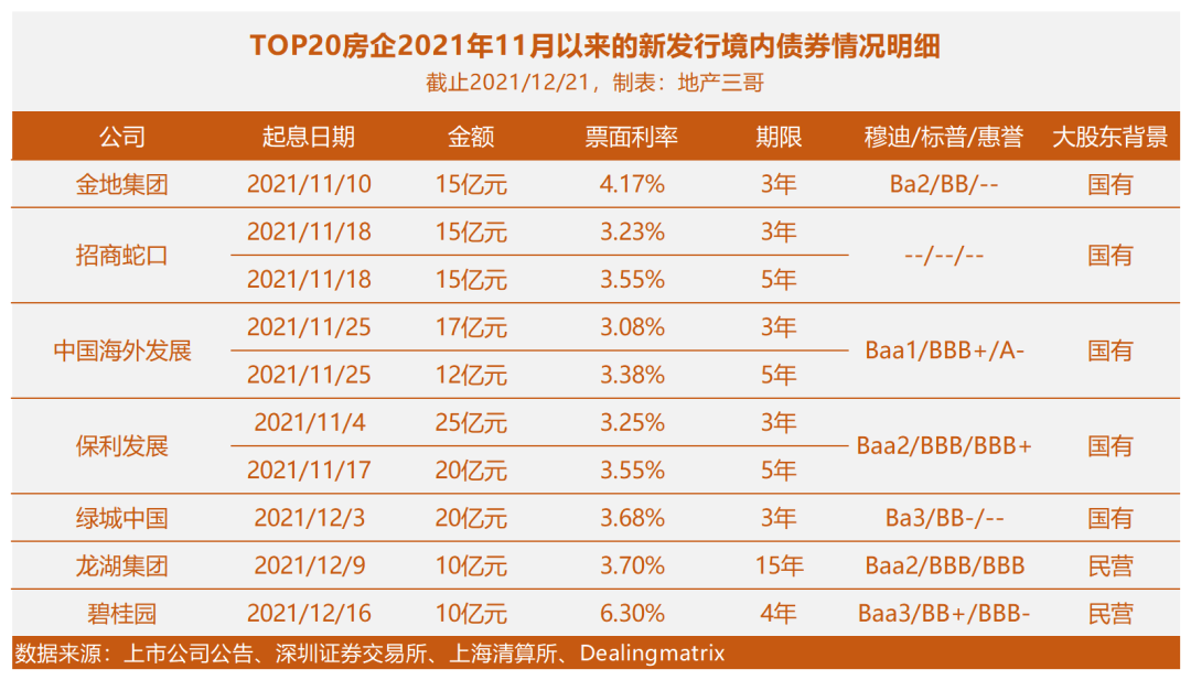 進(jìn)入11月份之后,TOP20房企中發(fā)行中期票據(jù)(公司債券)的房企有金地、招商蛇口、中海、保利、綠城和龍湖、碧桂園。