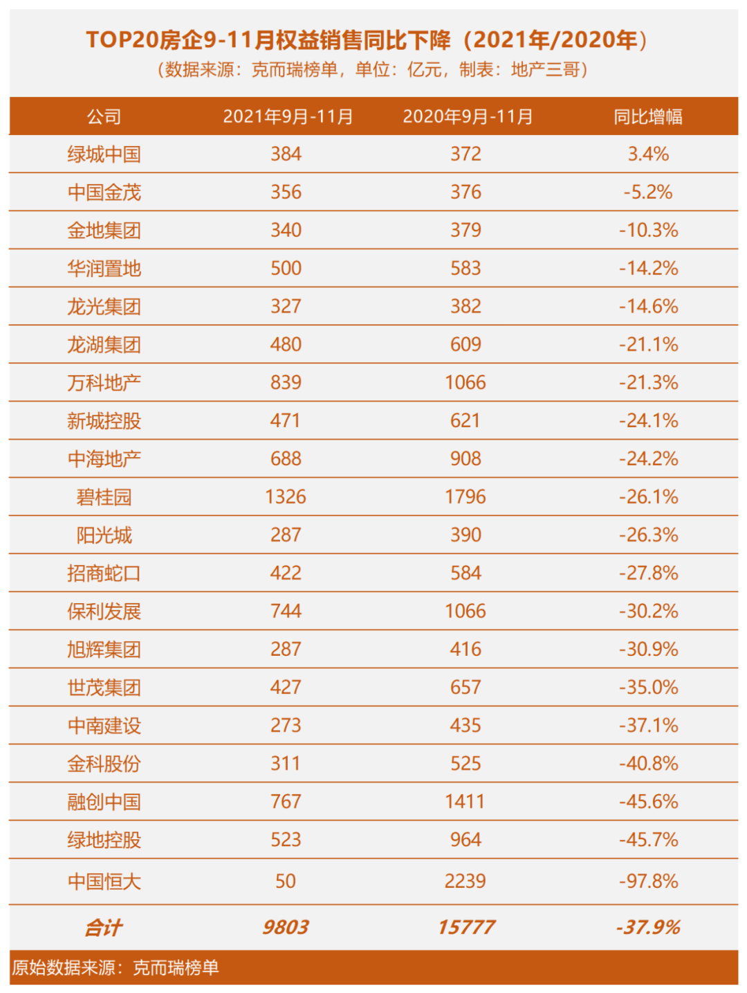 進(jìn)入9月份后,政策底部疊加市場(chǎng)預(yù)期探底,9-11月份房地產(chǎn)整體銷售情況很不樂(lè)觀,根據(jù)克而瑞的統(tǒng)計(jì),TOP20房企9-11月銷售同比2020年下降37.9%,同時(shí),房企間的分化也比較明顯。