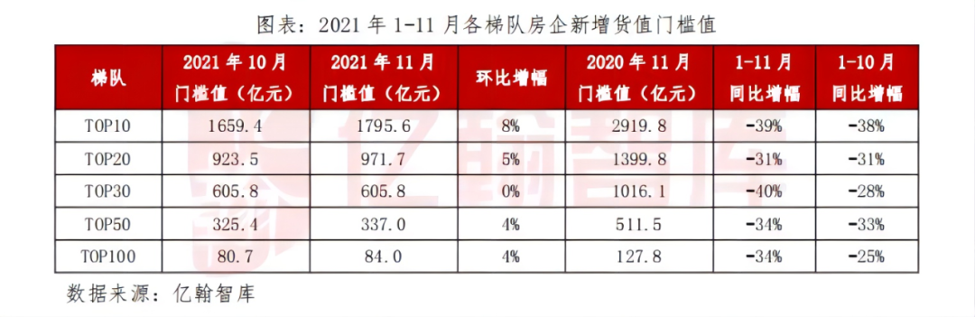 受其影響,為了續(xù)命、保命,房地產(chǎn)企業(yè)無(wú)疑會(huì)減少投資現(xiàn)金流出,拿地異常謹(jǐn)慎。進(jìn)入2021年下半年,頭部房地產(chǎn)企業(yè)防御性拿地、甚至不再拿地。2021年1-11月統(tǒng)計(jì)數(shù)據(jù)來(lái)看,頭部房企新增貨值平均降低了30%-40%。