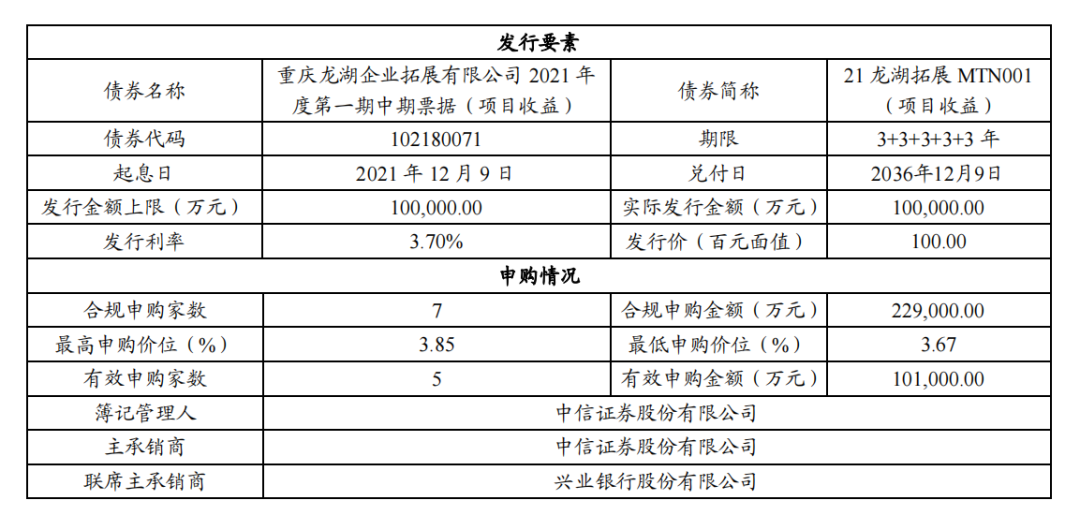 在此之前的12月10日,龍湖控股集團(tuán)有限公司發(fā)布公告,公司間接附屬公司重慶龍湖企業(yè)拓展有限公司已于2021年12月7日及8日公開發(fā)行2021年度第一期中期票據(jù),規(guī)模為人民幣10億元。期限15年,票面利率3.70%。