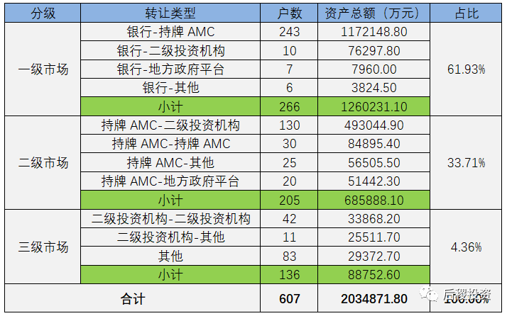 一般的,我們將銀行端出包為一級市場,持牌AMC出包為二級市場,除此為三級市場。
