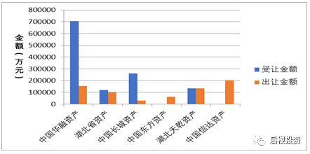 圖中數據為持牌AMC在整個不良市場所有收包、出包金額統計,僅根據當前數據統計,湖北省資產和湖北天乾資產收、出包金額較平衡;華融、長城收包>出包金額,東方、信達由于成交記錄未透露具體債權金額,暫不予分析。