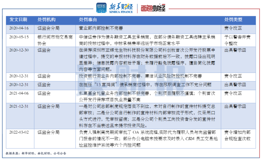 此外,2020年以來,“行業一哥”中信證券也多次受到來自證監會及其分局和銀行間市場交易商協會的監管處罰。